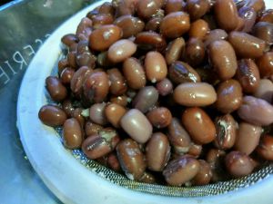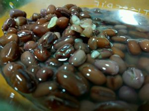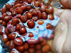 后沥干水倒进压力锅,放过面1.5-2厘米的水,压力锅上气后煮3-4分钟熄火,使红豆保持粒状,但是手指一压能轻易压扁的状态,沥水倒入冷水里降温去涩味。