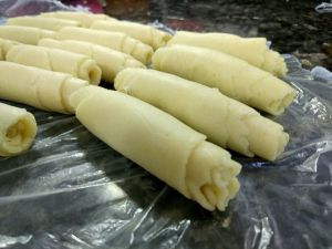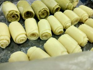 每个酥皮压扁,擀长卷起,密封静置20分钟。