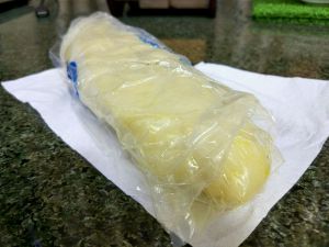 回温的麻薯馅包进密封袋子,放进冰箱成形。