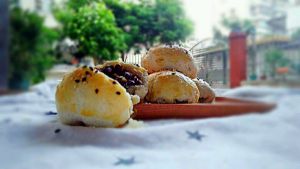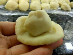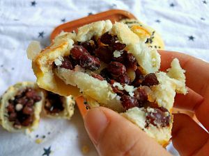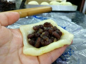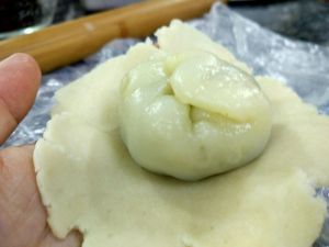 静置好的酥皮,两头往中间折,戳圆压扁,擀成皮,包入麻薯红豆馅,收口收密朝下。