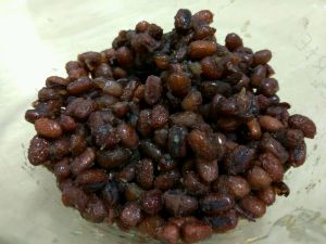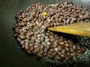 糖水倒进不粘锅,完全热冒泡的时候,倒入红豆粒,中小火盖盖子焖到水干。