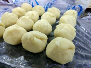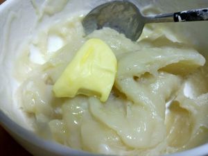 100g糯米粉,30g玉米淀粉,200g牛奶和50g白砂糖拌匀成细腻液体,密封进微波炉4分钟(2分钟的时候拿出来搅拌一次),取出来趁热放10g黄油。