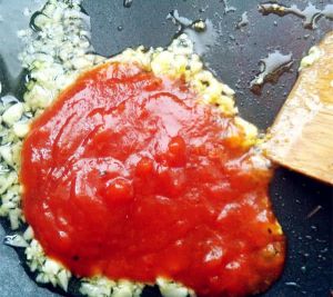 热锅热油爆香葱花儿和蒜碎之后,加入番茄酱和少许水、盐炒到酱汁粘稠。