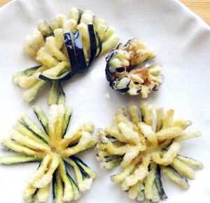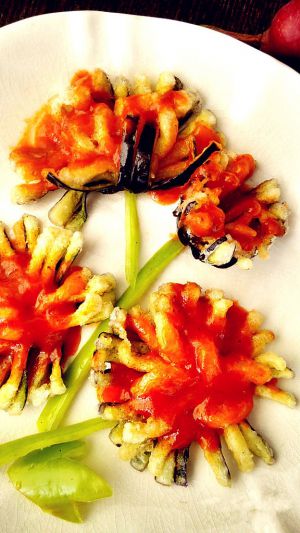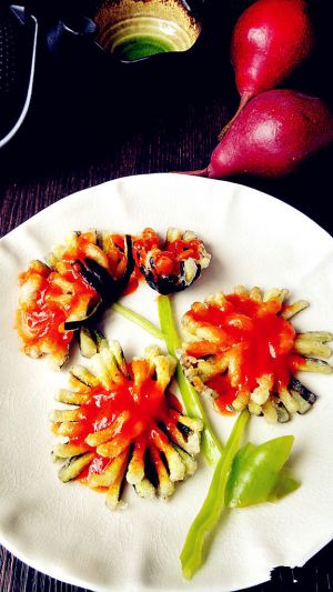 炸好的茄子摆盘。故意炸了一朵稍小的花苞状,另一朵炸成稍侧向,摆盘感觉更立体一些