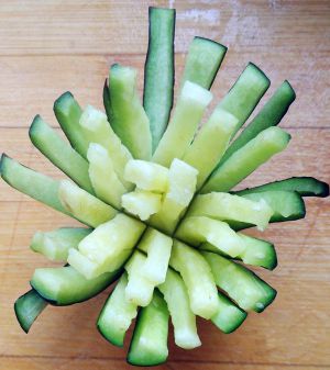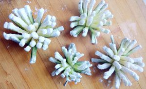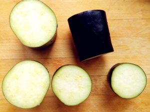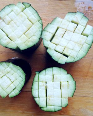 茄子洗净,去头尾,切墩。墩的高度决定花瓣长短。一般五厘米左右高我这茄子太细了,其实如果是粗茄子,削了皮切成方形,炸出来更规矩漂亮一些