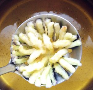 将茄花放在小漏勺上,另一只勺子舀油浇在茄花上定型后,入油锅炸到外皮酥脆金黄