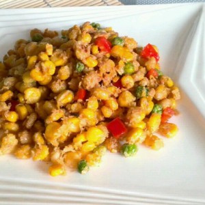 咸蛋黄炒出沫沫,赶紧放入玉米青豆红椒粒,加盐,糖翻炒均匀出锅。蛋黄炒过了手忙脚乱没顾上拍照片。
