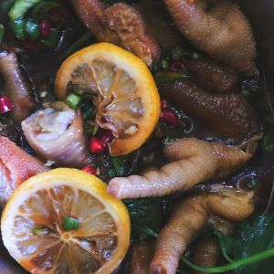 将鸡爪和柠檬片一起放入佐料盆中,搅拌均匀。放入冰箱并用保鲜膜覆盖。3小时后将柠檬片取出大部分。(留四片就够了)