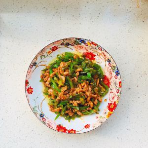肉丝取出后,用炒肉剩下的油,翻炒辣椒,至辣椒变软,再放少许盐和生抽,还有肉丝翻炒均匀。