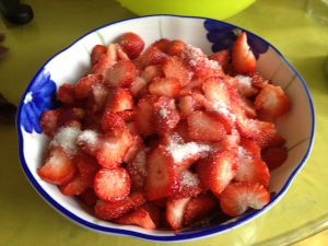 把草莓一切为二,大草莓可以切成好几块。切好后撒上一层薄薄的白砂糖。