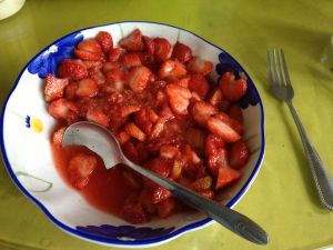 把撒上糖的草莓翻一下,再洒一层糖。等待几分钟,草莓出汁。