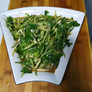 大葱、黄瓜、青椒切丝备用,香菜切断同时放入器皿。放入调味品搅拌,最好用一次性手套抓更好的入味。(青椒嫌生的话,可以入锅炒一下)