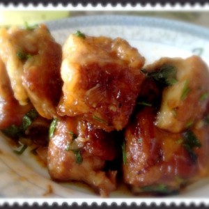 加入大量的糖和醋,大火炒出糖色。即汁水成黏稠状。最后撒上香葱和香菜。即可出锅了。有时我会放入菠萝一起炒,味道也很好。