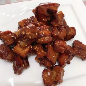 炒糖色大概需要这些冰糖,热锅凉油,放冰糖,小火熬,炒成香油色下排骨,炒一会放一勺番茄酱,加热水一定是热水,一勺生抽,两勺醋,熬40分钟,大火收汁,淋上水淀粉,来点白芝麻。