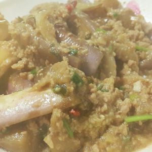 开锅,翻炒几下,茄子看似要熟的时候倒入搅拌好的肉馅再加少许水,放入适量盐 鸡粉 味精 酱油,再翻炒。