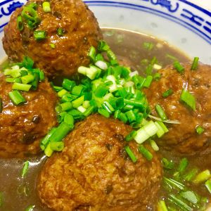 炸好的丸子加入清水、生抽、蚝油下锅焖好撒葱花。