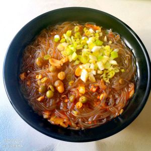 3.花生绿豆小火炒熟备用,辣椒油放一勺热水,放入粉丝、香菜、花生即可。