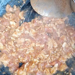 炒鸡蛋。鸡蛋不要炒火大,不然老了就不好吃了!炒完盛出备用。