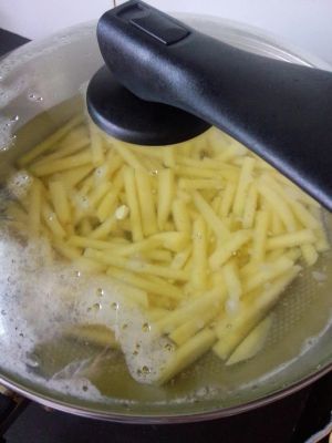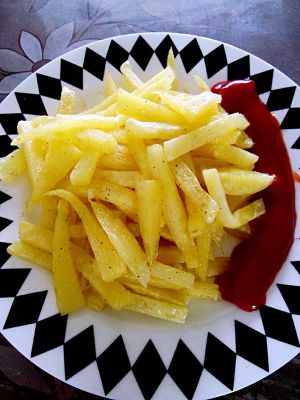 沥油后装盘 弄一小撮细盐 撒些黑胡椒 挤上番茄酱 味道跟kfc的一样哦 两个大土豆我一个人能吃三次 超级省