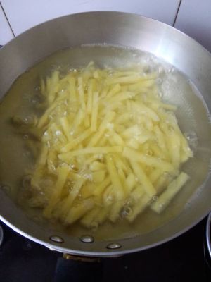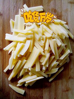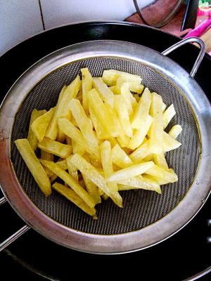 锅下油 油开转小火 下土豆条炸至棱角金黄色就捞出沥油