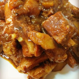 铁锅烧热,加油,放入两小勺糖,加入姜片,洋葱,八角,桂皮翻炒出色,将排骨倒入,加料酒一勺翻炒,加土豆块后放酱油继续翻炒上色