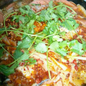 第四步骤,料炒好后倒入凉水烧开后鱼倒入,煮至3-4分种左右放入自己想吃的菜然后辣椒面放进去,在放鸡精,舀至碗中,可放香菜。