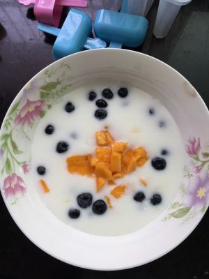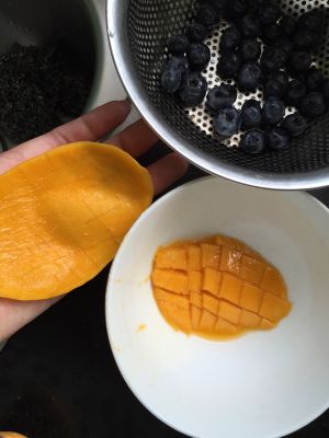 首先,噔噔,准备好材料,可以添加自己喜欢的水果,我买了蓝莓芒果,个人认为太多水分的比如西瓜这种就不太适合啦~