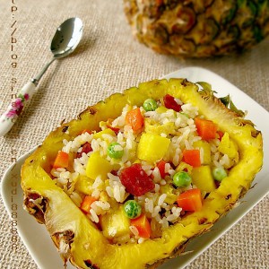 最后放入菠萝丁和青豆,快速翻炒几下,出锅装入菠萝壳内即可。