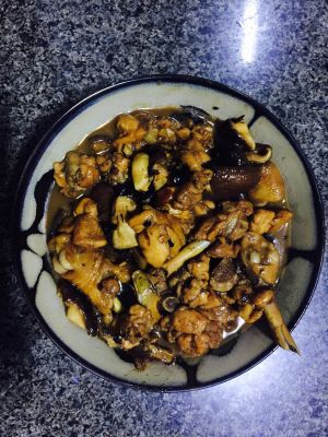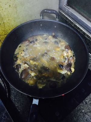 准备好食材后,热油爆炒蒜姜和辣椒,待炒出香味放鸡肉翻炒,加入料酒生抽和少量老抽,炒一会加水与鸡肉持平,再放入香菇,蒸煮时放入冰糖,不要放多噢!