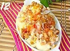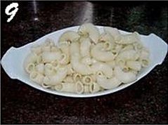 锅里水开后,放入泡软的通心粉,放点油,盐煮熟,捞起沥干水分,把通心粉装进烤碗;