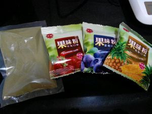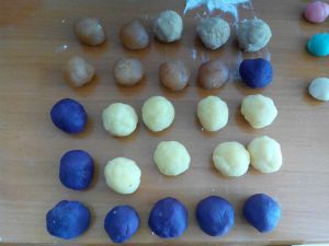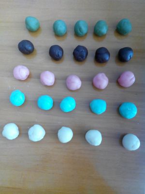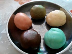 将皮分成5份,留一份原色,其余4份加入喜欢口味的果味粉,每份放2g就可以了。揉匀。