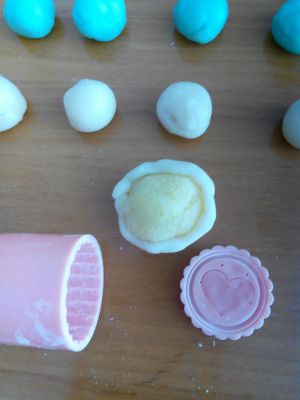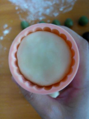 模具里撒上熟手粉,把胚塞到模具里,压扁,轻轻推出摸即可。