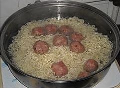 重新烧一锅水,水开后,把牛肉丸和面条放进去,大火煮开至牛肉丸浮起;
