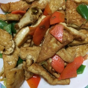 用葱姜爆香,放入胡萝卜和青椒炒熟,放入豆腐翻炒。放入酱油、五香粉、蚝油,盐翻炒好出锅。