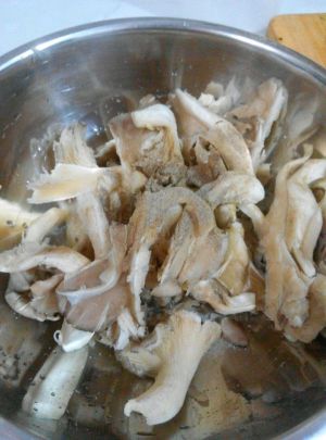 平菇洗净,攥干水分,加入黑胡椒粉,盐,鸡精,料酒,腌20分钟