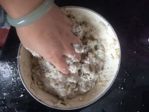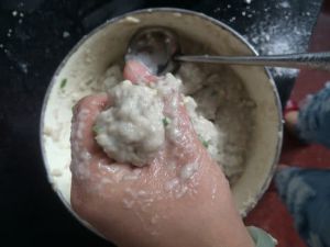 把剁好的水潺放入碗中,放入剁好的葱姜蒜,加入盐酒鸡精五香粉用手抓匀,再倒入红薯粉上下左右拌匀,使红薯粉能完全融入