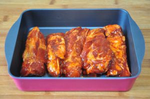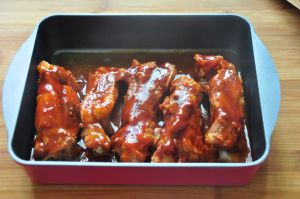 腌好的排骨沾上酱汁放入烤盘中码放整齐,剩下的烤肉酱备用。