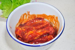 猪小排剁成10厘米左右的段,冲洗干净厚沥水,放入盆中,倒入酱腌制半小时。