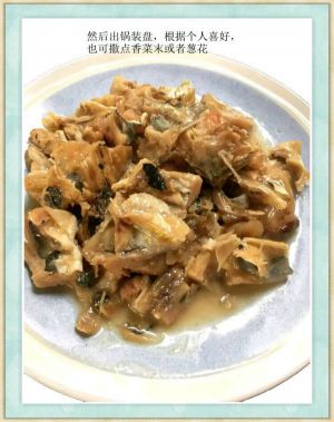 等五花肉炒的颜色有些变化了,放入鱼鲞一起炒,此刻可以加绍酒