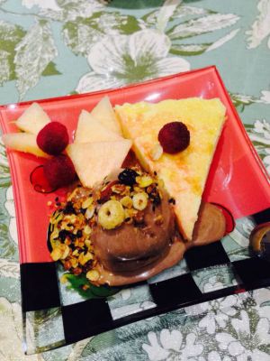 冰淇淋撒上自制的杂粮麦片,搭配上自制的重芝士蛋糕。完~美!