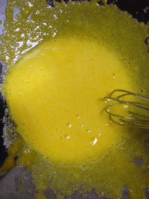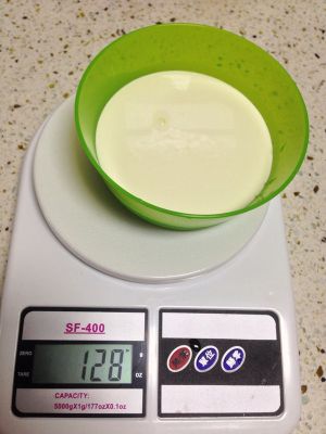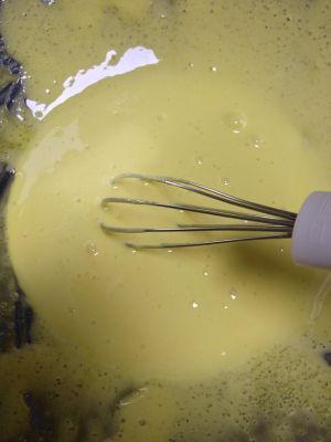 热牛奶分多次慢慢倒入打发好的蛋黄液里,搅拌均匀,放进冰箱冷藏。
