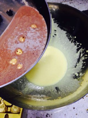 淡奶油称好,稍微打发。加入到冷藏好的蛋黄巧克力溶液里。