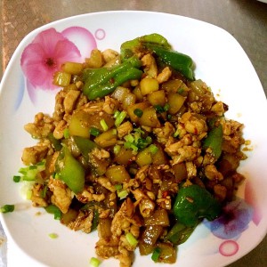 鸡肉切成丁。加料酒,蒜末,少量盐腌制