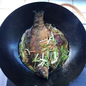 倒出锅中多余的油 留一点 把姜丝倒入锅中 炒出香味 然后加入一小碗水 和刚才的一小碗汁后把鱼放下去 开大火 煮开后 换小火 慢慢煮 让鱼入味 待水快煮干时 放入葱一起煮 然后起锅 大功告成