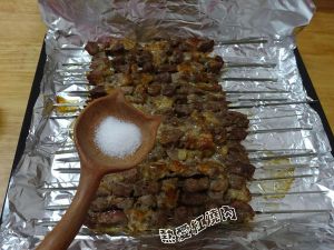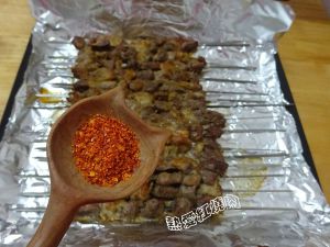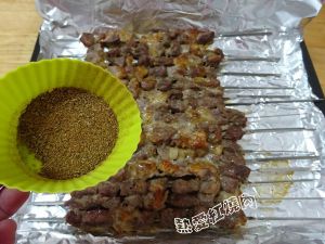 在羊肉串的正反面均匀的撒上一层孜然粉和孜然颗粒。