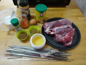 准备好食材:羊肉750克、孜然粉和孜然颗粒、辣椒粉、鸡蛋、鸡粉、白胡椒粉、盐、生抽、玉米油。