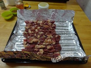烤盘上铺一张锡纸,将羊肉串摆放在锡纸上。