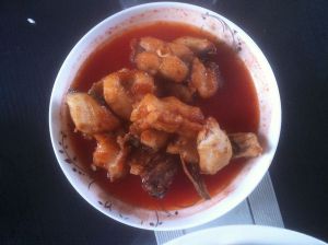 鲤鱼切块,用料酒、葱、姜、蒜腌制五分钟。