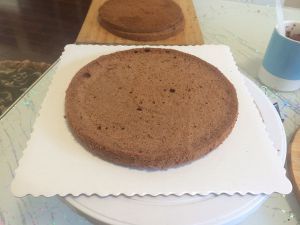 提前准备好一只八寸可可戚风蛋糕胚。切下一片做底部。