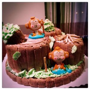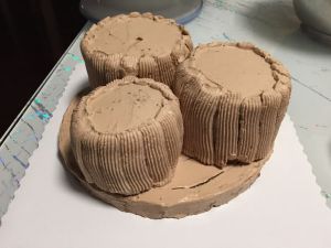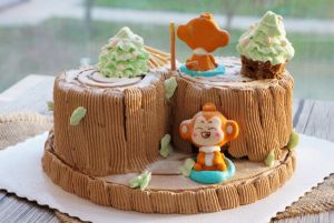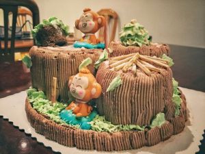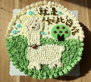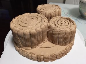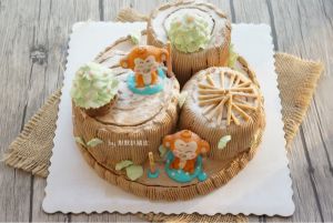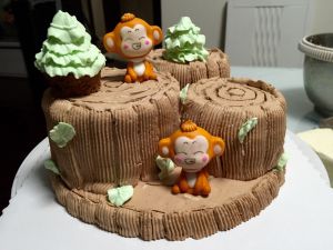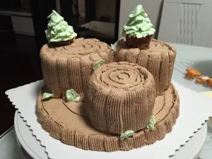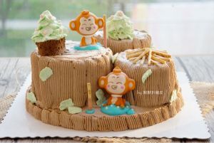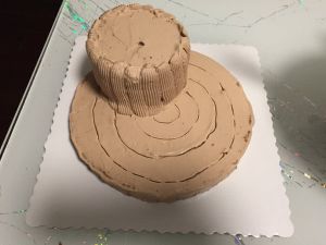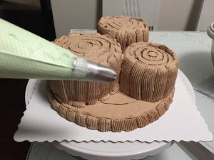 这样裱上叶子,以及裱上树。用了一小块蛋糕做底,旋转着裱一圈,上一层就小一圈。